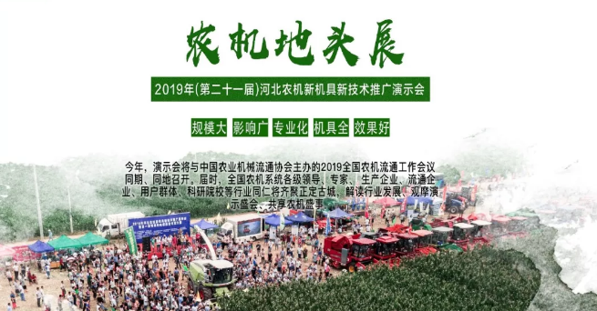 2019年河北農(nóng)機(jī)新機(jī)具新技術(shù)推廣演示會將于本月25日在河北省石家莊市正定縣南樓鄉(xiāng)召開!“規(guī)模大、機(jī)具全、專業(yè)化、影響廣、效果好”等優(yōu)點(diǎn)使得河北農(nóng)機(jī)新機(jī)具新技術(shù)推廣演示會成為了農(nóng)機(jī)企業(yè)進(jìn)行產(chǎn)品推廣的有效平臺,同時也為廣大農(nóng)民朋友提供一個現(xiàn)場觀摩機(jī)具作業(yè)的機(jī)會,切實(shí)提高購機(jī)的真實(shí)性和可靠性!